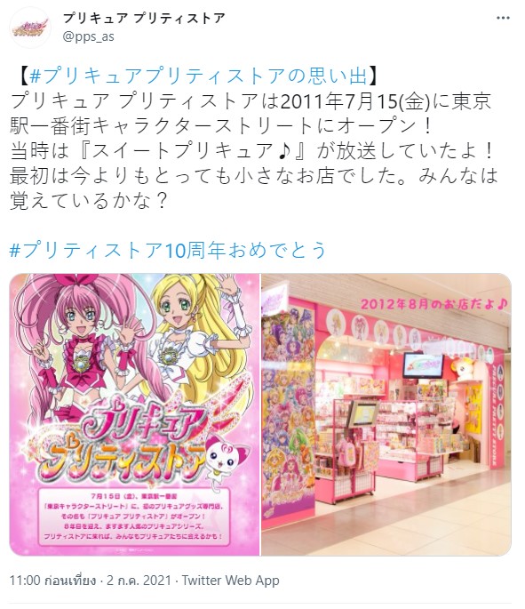 ต้องบอกว่าถ้าผมไม่ได้เปิดดูจาก Twitter ผมก็เกือบจะลืมไปแล้วว่าวันนี้ วันที่ 15 กรกฎาคม 2021 เป็นวันครบรอบ 10 ปีของร้าน Precure Pretty Store (プリキュア プリティストア) ที่เป็นร้านค้าทางการที่จำหน่ายสินค้าต่างๆที่เกี่ยวกับพรีเคียว (ที่ผมจะต้องแวะไปตลอดเวลาที่มาญี่ปุ่น)