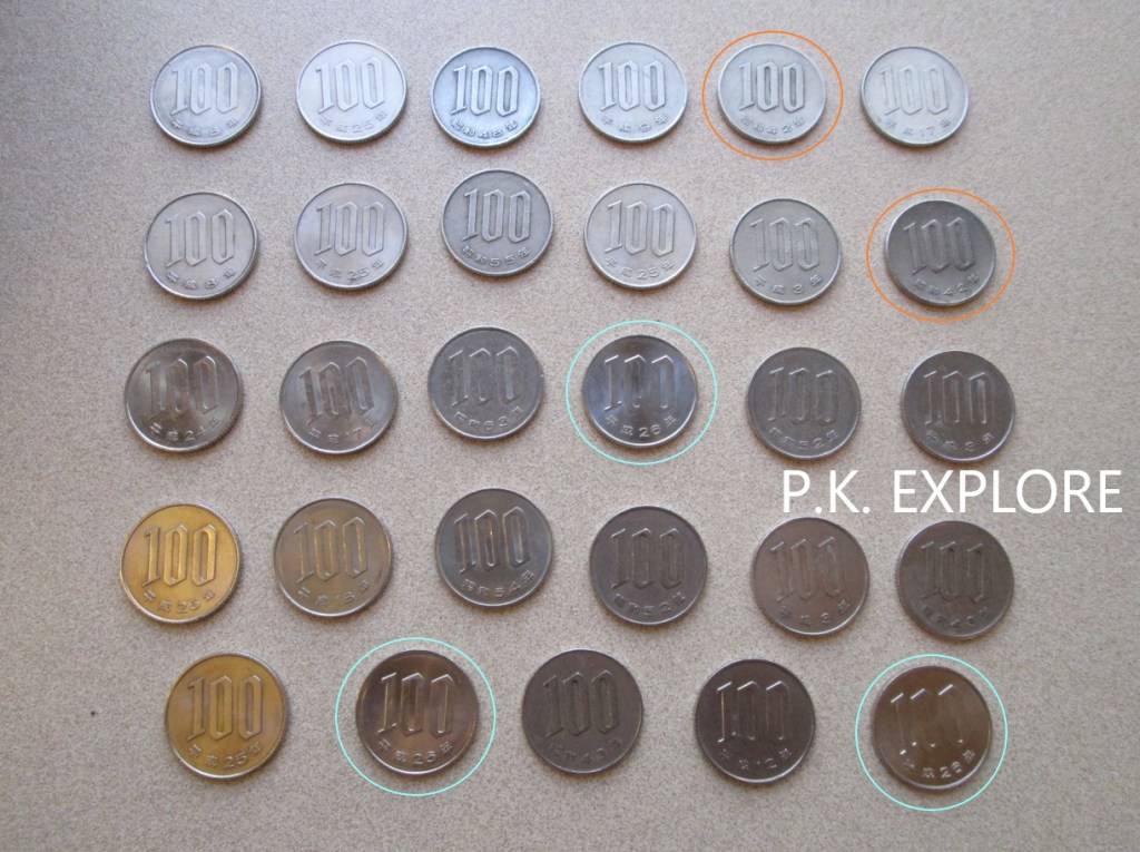 ส่วนเหรียญ 100 เยนรุ่นใหม่สุด (ที่ผมมีอยู่ในขณะนั้น) ก็คือเหรียญที่ถูกผลิตในปีเฮเซที่ 26 หรือปี 2014 ที่ผมทำวงกลมสีฟ้าไว้ มีอยู่ 3 เหรียญ