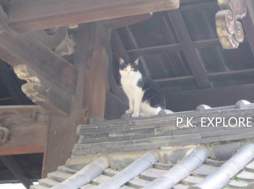 จากที่เห็น สิ่งที่เห็นจากในรูปก็คือแมวตัวหนึ่ง (ลายดำขาว) กำลังนั่งอยู่บนหลังคาของประตูทางเข้าด้านหนึ่งในศาลเจ้า (ต้องขออภัย เพราะผมจำไม่ได้ว่ามันเป็นประตูด้านไหนนะ) เหมือนราวกับว่ามันเป็นแมวเฝ้าประตูศาลเจ้า