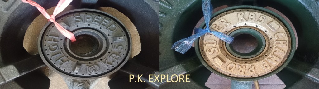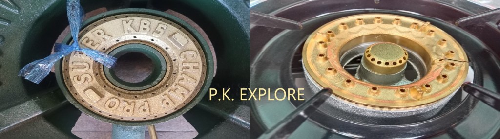 ด้านซ้ายมือก็คือฝาครอบของเตาแก๊สแรงดันสูง (ในนี้ก็คือเตา KB5) เป็นเหล็กแต่สีคล้ายๆทองเหลือง ส่วนด้านขวามือก็คือฝาครอบทั้งวงนอกและวงในของเตาแก๊สแรงดันต่ำที่ผลิตจากทองเหลือง ซึ่งมองจากทั้งสองรูปแล้วก็คล้ายกันมาก (ทำให้บางคนอาจแยกไม่ออกว่าอันไหนเป็นทองเหลืองจริง)