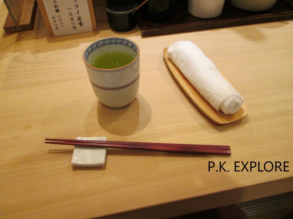 และก็เหมือนกับตามร้านอาหารญี่ปุ่นที่เราไปนั่งทานส่วนใหญ่ ก่อนที่เมนูทงคัตสึจะถูกเสิร์ฟตามที่ได้สั่งไว้ ทางร้านก็จะมีชาเขียวเสิร์ฟให้ก่อน พร้อมกับผ้าร้อนให้เช็ดมือ