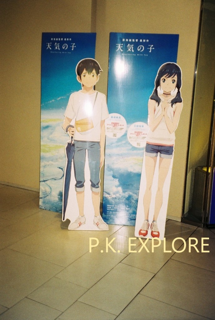 ป้ายสแตนดี้โปรโมทภาพยนตร์ Weathering With You ที่โรงภาพยนตร์แห่งหนึ่งในโตเกียว