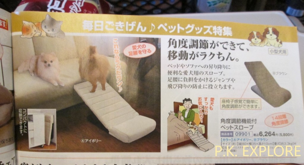 จากตัวรูปและคำอธิบายตาม(ที่ผมเข้าใจ)ก็คือ สินค้าตัวนี้เป็นเบาะเอียง (จะเรียกว่าเป็นทรง Slope ก็ได้) ใช้สำหรับวางติดกับโซฟาที่นั่งหรือติดกับเตียงนอนเพื่อไว้ให้สัตว์เลี้ยงสามารถเดินขึ้นไปนั่งหรือนอนใกล้ชิดกับเจ้าของได้ โดยที่พวกมันไม่จำเป็นต้องกระโดดให้เหนื่อยนะ อีกทั้งสามารถพับเก็บได้เมื่อไม่ได้ใช้งานแล้ว ส่วนราคาตามที่เห็นก็อยู่ที่ 6264 เยน (ประมาณ 1600 บาท รวมภาษีแล้ว แต่อันนี้เป็นราคาเก่า ราคาปัจจุบันน่าจะปรับขึ้นแล้ว)