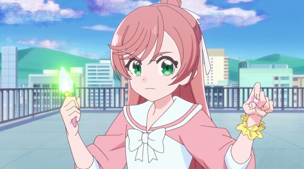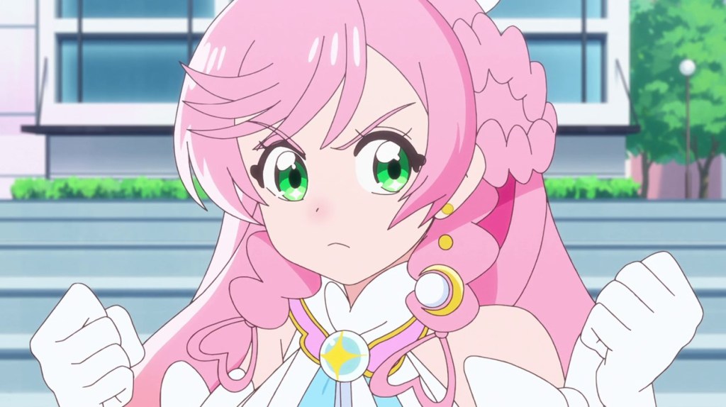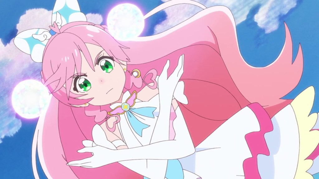 สำหรับในตอนที่ 4 ของ Hirogaru Sky! Precure นั้น เนื้อเรื่องก็ได้มาโฟกัสในส่วนของ Mashiro สักที (หลังจากที่ 3 ตอนแรกได้โฟกัสไปที่ Sora และเจ้าหญิง Eru) ซึ่งในตอนเธอก็ได้แปลงร่างเป็นพรีเคียวที่มีนามว่า Cure Prism ซึ่งเกิดจากการที่เธออยากจะช่วยเหลือ Sora ที่ถูกจับโดยเจ้า Ranborg ตัวหนึ่งที่ Kabaton ได้ปล่อยออกมา (จากที่เห็นจาก Screenshot อันบน ภาษากายของ Mashiro บ่งบอกได้เลยว่า “หนูเอาจริงไม่ได้มาแบบเล่นๆ” XD!)