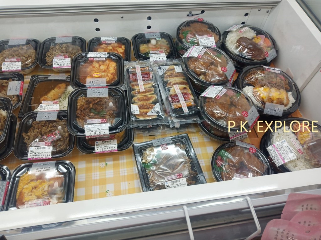 คือต้องบอกว่าเมื่อผมเดินไปตรงในส่วนที่เป็นชั้นวางอาหารกล่อง (ตามที่ได้เห็นจากในรูปที่ผมถ่าย) จะมีอาหารกล่องหลากหลายวางอยู่เรียงรายกันไปเยอะ (จะเป็นภาชนะทรงเหลี่ยมหรือทรงกลมก็ตาม) ไม่ว่าจะเป็น ข้าวแกงกะหรี่หมู, ข้าวหมูย่าง, ข้าวหมูทงคัตสึ, ข้าวไก่เทอริยากิ, สปาเก็ตตี้, ยากิโซบะ หรือแม้แต่ข้าวเนื้อวัวย่าง (ที่ผมเคยซื้อมาโดยไม่รู้จริงๆ) อะไรแบบนี้