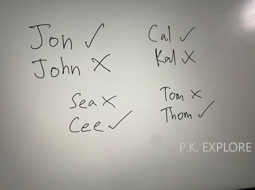 จากประสบการณ์ของผม สิ่งที่ผมมักจะทำตลอดคือเวลาที่ผมจดชื่อของลูกค้าแต่ละคน ผมจะทั้งจดไปด้วยและสะกดออกเสียงให้ลูกค้าฟังว่าชื่อของลูกค้าคนนั้นผมจดและสะกดถูกต้องหรือไม่ โดยส่วนมากผมจะสะกดชื่อของลูกค้าเกือบถูกหมด และมีส่วนน้อยที่ผมจะสะกดชื่อของลูกค้าไม่ถูกต้องจากที่ควรจะเป็น