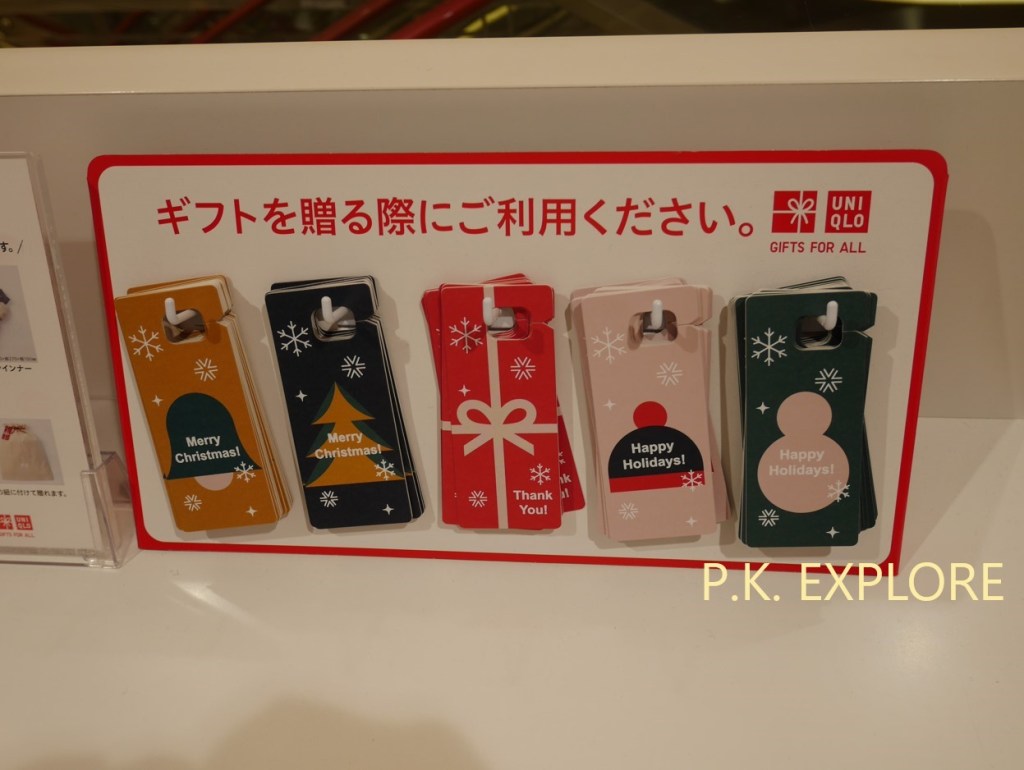 อย่างที่เห็นในรูป ปีนี้ทาง UNIQLO ญี่ปุ่นก็มี Gift Tag แจกให้สำหรับคนที่ซื้อสินค้า UNIQLO เพื่อที่จะนำไปมอบเป็นของขวัญ ซึ่งมีทั้งหมด 5 ลายตามที่เห็น และก็มีคำที่ระบุไว้บน Gift Tag แต่ละใบ มีทั้ง Merry Christmas, Happy Holidays และ Thank You พร้อมกับลายกราฟฟิกในธีมเทศกาลคริสต์มาสที่เรียบง่าย ส่วนด้านหลังของแต่ละใบ จะเป็นช่องว่างและมีบรรทัดให้เราเขียนว่าเราจะมอบให้ใครและใครเป็นผู้ให้