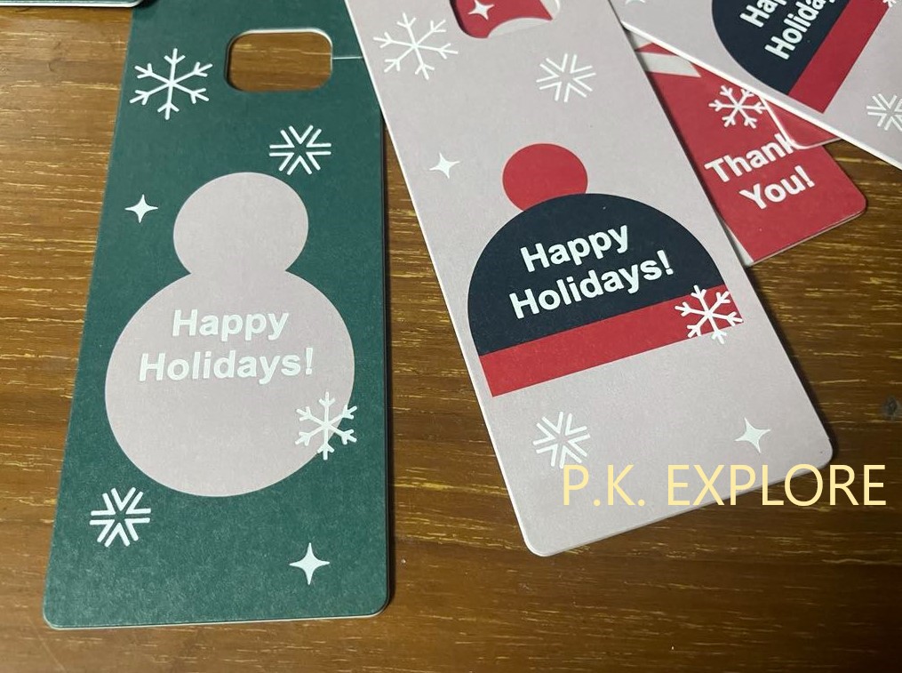 ตอนที่ผมเห็น Gift Tag เหล่านี้ ผมก็ไม่ลังเลถามพนักงานว่า Gift Tag เหล่านี้แจกฟรีหรือเปล่า (ถามเพื่อความแน่ใจ) พนักงานตอบกลับว่าแจกฟรี สามารถหยิบไปได้เลย และหยิบไปได้หลายอันด้วย ผมก็เลยหยิบมาครบทุก 5 ลาย เพื่อที่จะเก็บไว้ใช้แนบติดส่งกับของขวัญให้กับบุคคลที่ผมจะต้องการส่งให้