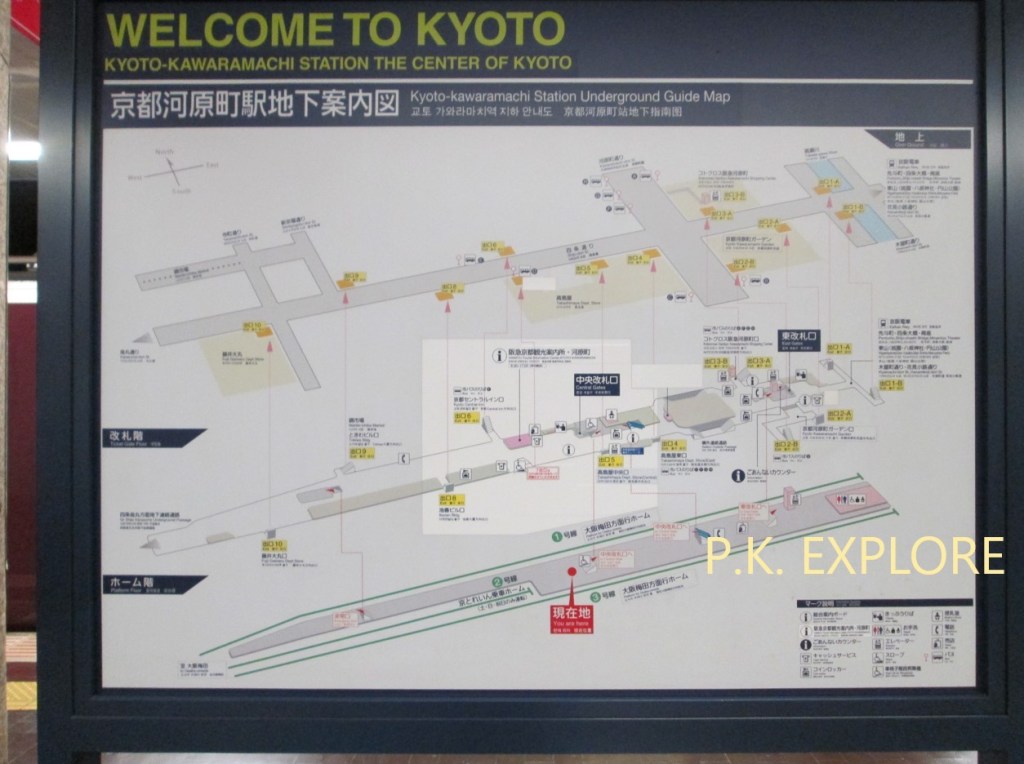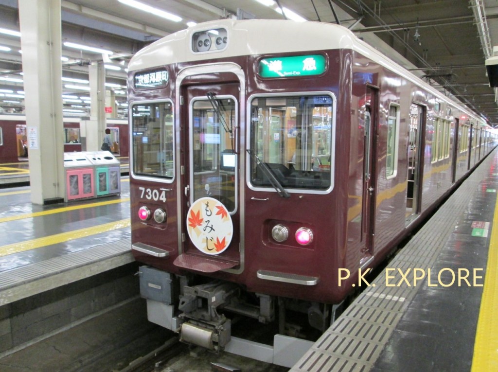 ส่วนตอนที่ขึ้นรถไฟจากสถานีต้นทาง Osaka-Umeda (HK01) ในเมื่อผมจะไปเกียวโต ผมก็ต้องนั่งสาย Kyoto เพื่อที่จะไปลงที่สถานี Kyoto-Kawaramachi (HK86) ซึ่งเป็นสถานีปลายทาง โดยจะมีขบวนรถไฟหลายแบบที่สามารถเลือกนั่งได้ แต่ถ้าจะดีที่สุด ควรที่จะนั่งขบวนรถไฟแบบ Express (สีเหลืองเข้ม) หรือ Semi-Limited Express (สีแดง) เพราะสองขบวนนี้จอดตามสถานีต่างๆน้อยสุด (ใช้เวลาในการเดินทางประมาณไม่เกิน 1 ชั่วโมง)
