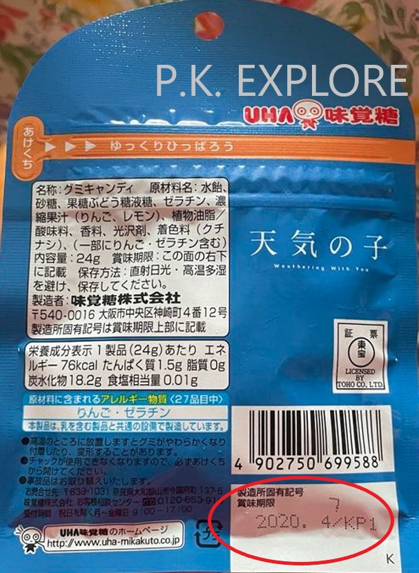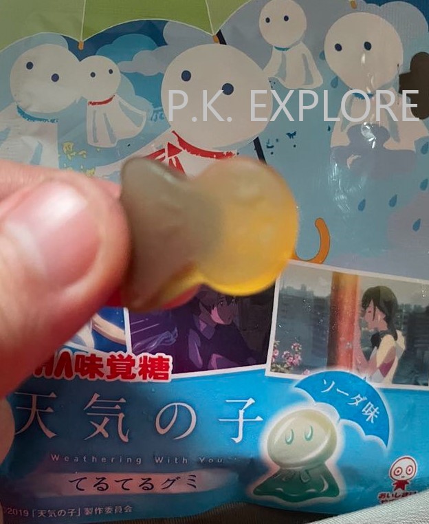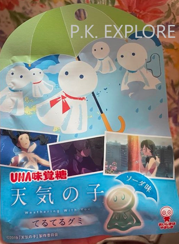 ผมจำได้ว่าซื้อถุงขนมเยลลี่ถุงนี้จากโรงภาพยนตร์แห่งหนึ่งในโตเกียวพร้อมกับสินค้าชิ้นอื่นๆจากภาพยนตร์ Weathering With You ตอนที่ผมไปญี่ปุ่นเมื่อปี 2019 คือในตอนนั้นกระแสของภาพยนตร์เรื่องนี้แรงมากๆ ถึงกับมีสินค้าหลายอย่างออกมาวางจำหน่ายรวมไปถึงถุงขนมนี้ด้วย