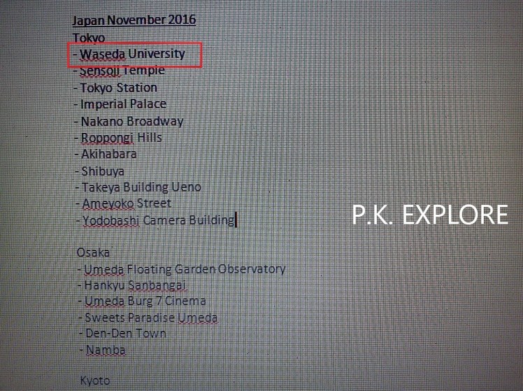 ก็อย่างที่ผมได้บอกไป ท้ายสุดผมก็ไม่ได้ไปเที่ยวมหาวิทยาลัยวาเซดะ เหตุผลก็น่าจะมาจากเรื่องของเวลาเที่ยวที่จำกัดที่ผมมองแล้วว่าไม่สามารถจัดการได้ลงตัว ผมเลยต้องตัดออกไป (จริงๆก็น่าจะมีสถานที่อื่นๆตามที่ได้เห็น ที่ผมได้ตัดออกไปด้วยเช่นกัน)