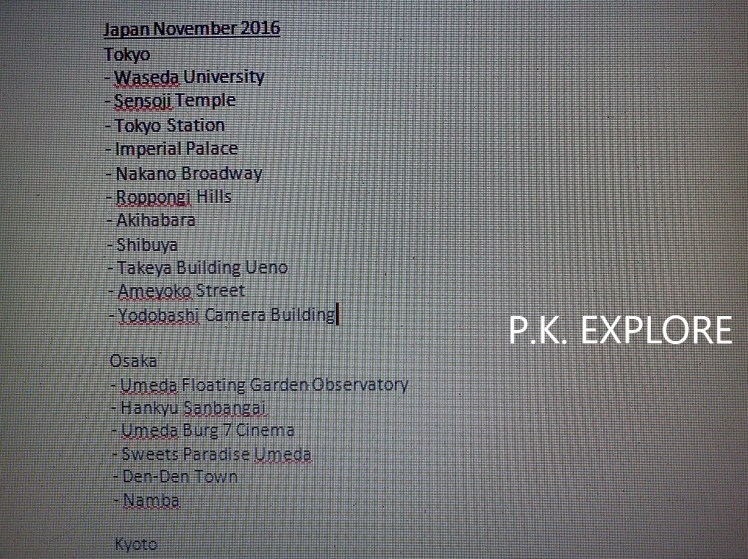 ซึ่งก็คือรายชื่อสถานที่ที่ผมวางแผนจะเที่ยวในทริปญี่ปุ่นของผม เมื่อตอนพฤศจิกายน ปี 2016 (นับถึงตอนนี้ก็ผ่านมาเกือบ 9 ปีแล้ว)